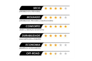 • Padrão de banda de rodagem otimizado: Este padrão de banda de rodagem oferece melhor desempenho em estradas molhadas e neve, bem como melhor tração em trilhas fora de estrada.